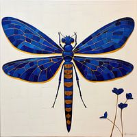 Libelle in blauw - Dit kunstwerk toont een gestileerde, oversized libelle op een egale achtergrond, met een klein motief van planten in de rechterbenedenhoek. De stijl combineert een grafische scherpte met een rustiek gevoel vanwege de zichtbare penseelstreken. Het kleurgebruik is voornamelijk koningsblauw voor de vleugels en een warme…
