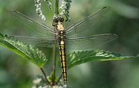 een jonge libel (Orthetrum cancellatum) met een geel lichaam en donkere strepen, zittend op de tak van een bloeiende brandnetel. De bladeren van de brandnetel werken als derde vleugels