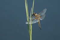 Een libelle zit tegen een groene rietstengel in de Amsterdamse Waterleiding duinen. De libelle is superscherp in beeld gebracht.