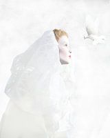 Fantasie portret van een vrouw in een witte jurk met rood haar in high-key. Conceptuele kunst over dromen en vrijheid. Abstracte mixed media in wit.