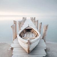 Twee oude houten objecten — een bootje en een steiger — houden elkaars gezelschap in een wereld die bijna niets meer vraagt. Alles is zacht. Alles is licht. Alles is weg — behalve deze twee die wachten, herinneren en tegelijk langzaam oplossen.