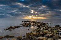 Langs de oevers van de Westerschelde voert een lijn van verweerde stenen het oog rustig het water in richting de verre horizon.