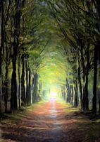 Digital Art als olieverf van een bomenlaan met licht aan het einde van het pad. Bruine bladeren op de grond en groene bladeren aan de bomen