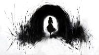 Deze afbeelding toont het silhouet van een vrouw die naar een fel licht in een donkere tunnel loopt. Het tafereel is geschilderd met zwarte inktstreken. Het toont begrippen als hoop, ontsnappen en uitdagingen overwinnen. De duisternis van de tunnel contrasteert met het heldere licht aan het einde, dat hoop en een betere toekomst…