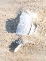 Meeuwenveer op het strand. De dauw van de nacht ligt nog op de vlaggen.