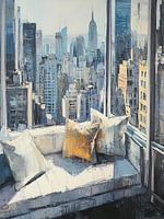 Licht en Uitzicht vanuit de Hoogte - In dit moderne stads uitzicht schilderij zie je een koffietafel met kussens in een lichte ruimte, waarbij grote ramen een prachtig uitzicht op de skyline van een stad met hoge gebouwen en de iconische Empire State Building bieden.