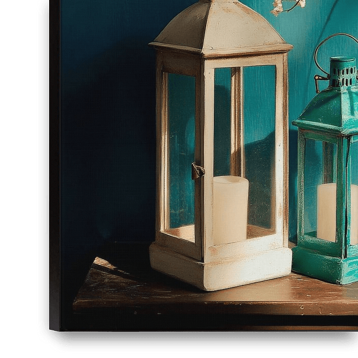 Zachte lichtspelingen en een vleugje natuur geven dit liefdevol gerangschikte duo nostalgische lantaarns een rustgevende sfeer. Het elegante contrast tussen het delicate wit en het sterke turkoois harmonieert perfect met de zachtblauwe tint van de muur. Ideaal voor een woonkamer, waar ze gezelligheid en stijlvolle accenten toevoegen.