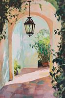 Een uitnodigende doorgang, verlicht door een nostalgische lantaarn, trekt het oog naar de weelderige groene kleuren van de planten. Zacht licht danst over de terracottakleurige vloer en verleent het tafereel een dromerige, bijna magische sfeer. De zweem van rust en natuur wekt een verlangen naar ontdekking en laat je even stilstaan.