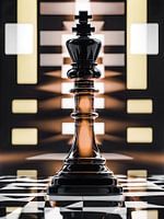 Dit kunstwerk toont een schaakkoning, centraal en in al zijn glorie, met een achtergrond van strakke, geometrische patronen. Het gebruik van glasachtige en glanzende materialen geeft de koning een moderne, futuristische uitstraling. Het spel van licht en schaduw voegt een extra dimensie toe, waardoor het lijkt alsof de koning letterlijk en figuurlijk in de schijnwerpers staat.