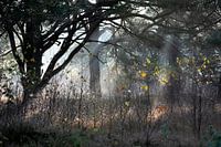 Koude vriesochtend in de late herfst met een beetje gebladerte en waanzinnig mooi licht