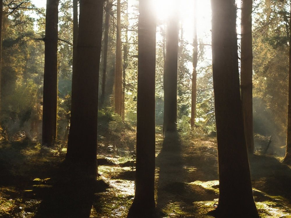 Een foto die rust uitstraalt. Zonlicht en schaduw spelen in het bos.