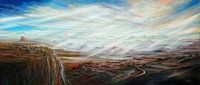 Dit olieverfschilderij toont een indrukwekkend tafereel dat de uitgestrektheid en majesteit van de natuur op fascinerende wijze vastlegt. Op de voorgrond strekt een bergweg zich krachtig uit door het schilderachtige landschap. De weg slingert zich door bochten en steekt een brug over terwijl hij langzaam naar de verte loopt. Deze weg…