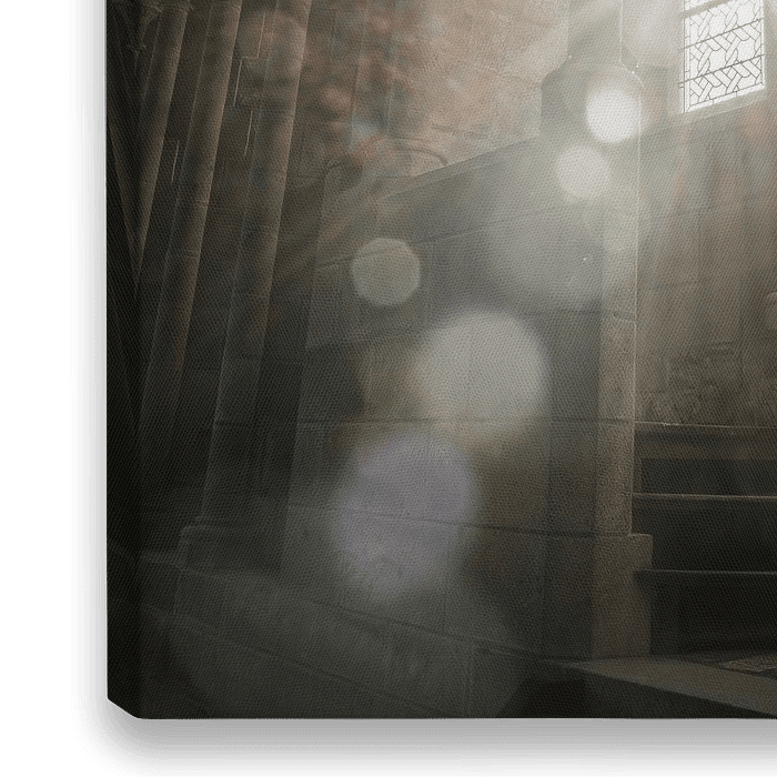 Deze sfeervolle opname toont een zonnestraal die door een smal, gotisch raam in een oude abdij valt, waarbij het licht zich in waaiervorm verspreidt over verweerde stenen en pilaren. De lensflare en stofdeeltjes in de lucht versterken de mystieke, bijna heilige sfeer van het beeld. De architectonische details zoals zuilen, bogen en…