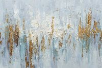 De witte achtergrond biedt ruimte en rust, terwijl de dikke verfstreken een voelbare diepte aan het werk toevoegen. De glans van het goud vangt het licht subtiel, wat het kunstwerk een warme gloed geeft zonder overweldigend te zijn. De lichte blauwtinten brengen lucht en frisheid, alsof het canvas ademt.