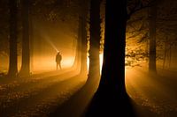 Een wandelaar met een lamp loopt 's nachts in een donker, mistig en mystiek bos in de omgeving van Roden, Drenthe. De donkere bomen steken strak af tegen de felle lichten op de achtergrond.