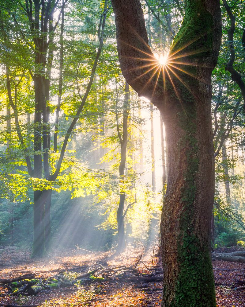 Het Speuldersbos is een mooie plek om in de herfst te fotograferen. Deze ochtend was er lichte mist en doordat de zon doorkwam ontstonden er fraaie zonneharpen. Ik kon hier de zon precies tussen de takken van de boom positioneren waardoor er een fraaie zonnester ontstond.