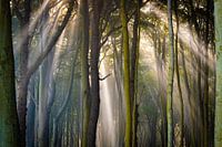 De zon schijnt door de mist het bos in