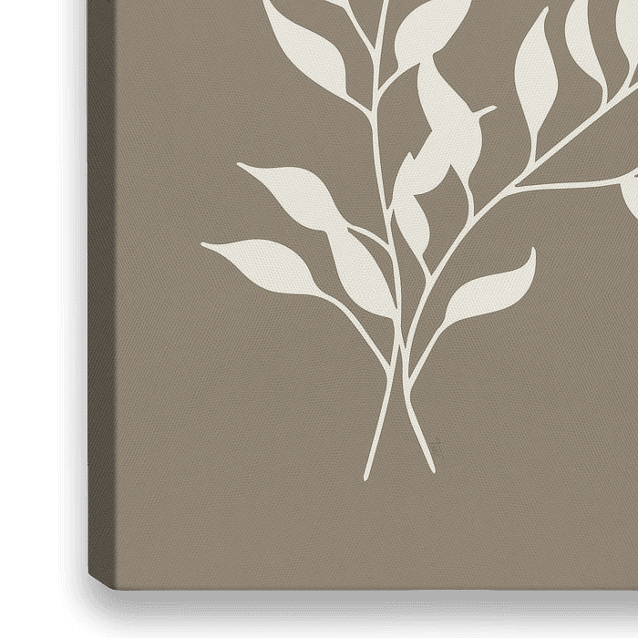 Minimalistische illustratie van twee stijlvolle stengels met kleine blaadjes in natuurwit, op een licht getextureerde achtergrond in een lichte, gedempte omber tint.
