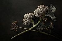 Een verfijnd en verstild stilleven waarin twee bloemkolen als sculpturen uit het duister treden. Hun grillige oppervlak en de nerfstructuur van het blad worden subtiel uitgelicht tegen een diepe, bijna fluwelige achtergrond. Dorre zaadstengels liggen als grafische accenten in het beeld, wat het werk een poëtische, bijna vergankelijke…