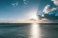 De zon schijnt door de wolken, en prachtige weerspiegelingen van licht schijnen in de lucht van Römö.