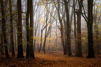 Licht en schaduwen op een mistige ochtend in een herfst bos