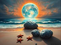 Dit surrealistische kunstwerk ontvouwt zich als een droom die zich langzaam laat begrijpen. Boven een kalme zee zweeft een vurige bol, losgemaakt van zwaartekracht en logica. Het is geen zon, geen planeet, maar een innerlijk licht: een visueel ankerpunt dat het landschap overstijgt en de kijker uitnodigt tot interpretatie.…