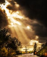 De windmolen van Rijperkerk in de lichtbundels van de zon die net door het zware wolkendek heenpiept