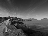 Zwart wit foto van de vuurtoren bij de haven van Kabelvåg op de Lofoten in Noorwegen. Het uitzicht vanuit ons traditioneel vissers huisje (of op z'n Noors Rorbuer) in dit pittoreske vissersdorpje in de gemeente Vågan op de Lofoten.