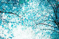 Een fotobewerking van het bladerdak van bomen tegen de lucht in genomen. De cyaankleurige bladeren vormen een pointilistisch patroon tegen de witte lucht.