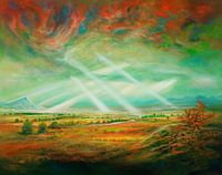 Het schilderij toont een fascinerend scenario waarin lichtstralen uit twee verschillende richtingen elkaar lijken te ontmoeten in de lucht. Normaal gesproken zijn dergelijke kruisingen van lichtbronnen niets ongewoons en komen ze vaak voor in de alledaagse wereld. Maar hier ontstaat een denkspel dat de waarneming op de proef stelt: Zijn…