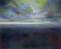 Het olieverfschilderij met de titel "Line of Light" presenteert een indrukwekkende compositie die de kijker meeneemt naar een fascinerend landschap. In het midden van het schilderij strekt zich een kaarsrechte, heldere lijn uit over de horizon. Deze lijn trekt onmiddellijk de aandacht en fungeert als een lichtgevend ankerpunt in het landschap. Het geeft het schilderij een duidelijke visuele symmetrie en balans.