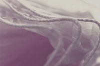 Dit abstracte werk toont een close-up van fijne, doorschijnende stof in een zachte lila kleur. De zichtbare naden langs de randen van de stof geven de compositie een duidelijke lijn, terwijl de zachte overlays en de onscherpte in de achtergrond een sfeervolle diepte creëren. De foto maakt geen gebruik van representatieve motieven en concentreert zich volledig op materialiteit, licht en structuur.