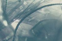 Dit abstracte werk toont een close-up van doorschijnende, lichtblauwe stof. De fijne draden en de delicate textuur van het materiaal vormen een gelaagde, bijna gewichtloze compositie door superpositie en het spel van licht. De foto vermijdt bewust figuratieve motieven en concentreert zich op het effect van structuur, transparantie en licht.