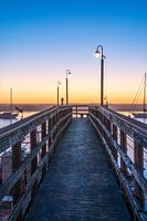 Een serene zonsopgang werpt een warme gloed over een rustige pier die zich uitstrekt in kalm water waar boten aanmeren. Lampen langs het houten dek van de pier verlichten het pad onder een heldere hemel bij zonsondergang. Gefotografeerd in de haven van Morro Bay. Morro Bay, Californië.
