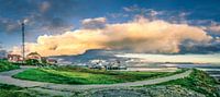 In de haven van West-Terschelling komt een prachtige middag in oktober tot een eind. De laatste strepen zonlicht laten de wolken exploderen in kleuren. Een klein beetje regen wordt zichtbaar door een regenboog. Dit panorama is gemaakt met drie foto's.
