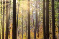 Zonnestralen schijnen tussen de bomen van het bos in de herfst