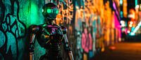 In een betoverend, neonverlicht stadslandschap staat een robotachtig wezen dat fonkelt met levendige groene lichten. De contrasterende kleuren van de graffiti op de achtergrond geven het beeld een dynamische energie. Dit kunstwerk is ideaal voor een moderne woonkamer, voegt een cool, futuristisch accent toe en stimuleert de verbeelding.