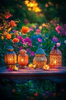 Sanfte Lichtspiele tanzen aus kunstvoll verzierten Laternen, umgeben von einem Blütenmeer in lebhaften Farben. Ihre warmen Glanzlichter schaffen eine einladende Atmosphäre und laden zur Entspannung ein. Ideal für das Wohnzimmer, verleiht dieses Arrangement jedem Raum einen Hauch von Magie und romantischem Flair.