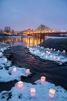 Blauwe wonder in Dresden/Saksen met theelichtjes aan de riviermonding in de winternacht