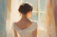 Zacht licht stroomt door het raam en omhult het silhouet van een jonge vrouw in een delicate, eenvoudige jurk. Haar haar zit elegant in een knoop en haar blik is naar buiten gericht, alsof ze in gedachten verzonken is en opgaat in een andere wereld. De sfeer is kalm en dromerig, vol verlangen en mysterie.