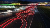 Koplampen en achterlichten van auto's zorgen voor een dynamisch en kleurig schouwspel van lichtstrepen op de snelweg A59 in de duisternis van de avond. Bij het maken van de foto is een creatief en speels accent toegevoegd...