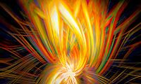 Een abstract expressionistisch schilderij van een lotusbloem in samensmelting van geometrische vormen.