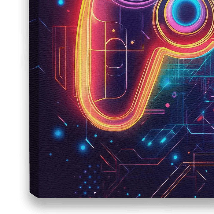 Heldere kleuren in pulserend neon omlijsten een gestileerde controller die eruitziet alsof hij uit een futuristische dimensie komt. Elk element straalt energie uit en belooft spannende avonturen in virtuele werelden. Het dynamische lichtspel en de geometrische patronen geven het beeld een hypnotiserende diepte die zowel gamers als…