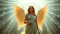 De prachtige engel zweeft zachtjes in een hemel van pastelkleuren die een gevoel van vrede en harmonie verspreiden. Zijn grote, vederlichte vleugels zijn een fascinerend kleurenspel van iriserend blauw, zacht roze en stralend goud. Elke vleugelslag is een symfonie van licht die de omgeving in een warme, gouden gloed hult.