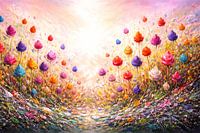 Deze bloemenserie is gemaakt als een abstracte, expressieve interpretatie van een bloemenveld. In plaats van een realistische weergave ligt de nadruk op kleur, beweging en emotie. De individuele bloesems zijn bewust vereenvoudigd en bijna sculpturaal, terwijl de achtergrond bestaat uit dynamische, soms wilde kleurstructuren.