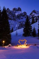 Deze is foto is genomen tijdens het blauwe uur in de Oostenrijkse Alpen. Onderaan de voet van de Bischofsmütze staat in een winterlandschap een verlicht hart van boomtakken.