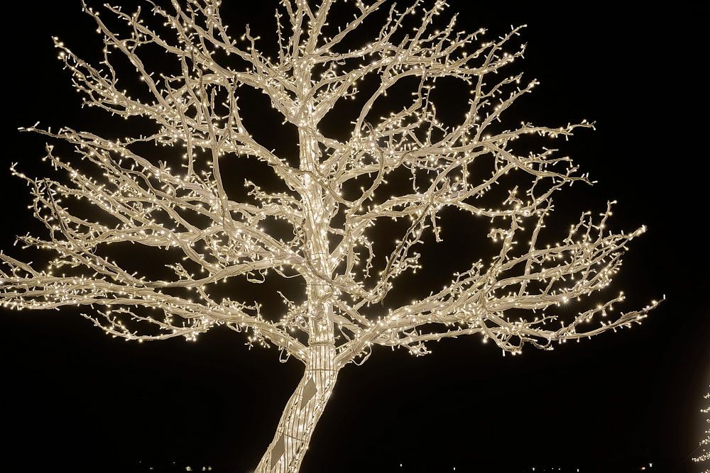 Boom van fonkelende feeënlichtjes als verlichte lichtinstallatie en decoratie in een openbaar park in Maagdenburg om de sfeer voor Kerstmis en het donkere seizoen te bepalen. Helaas was er op dat moment geen sneeuw, wat de romantische stemming zou hebben versterkt.