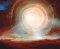 Het schilderij vangt op meesterlijke wijze de essentie van licht in zijn imposante dimensie. In het midden troont een overweldigende kegel of spiraalvorm aan de hemel, bijna als een uitnodigende grot van licht van waaruit stralend licht omhoog stroomt en zijn brede stralen over de aarde uitstort. Deze voorstelling roept een mythische…