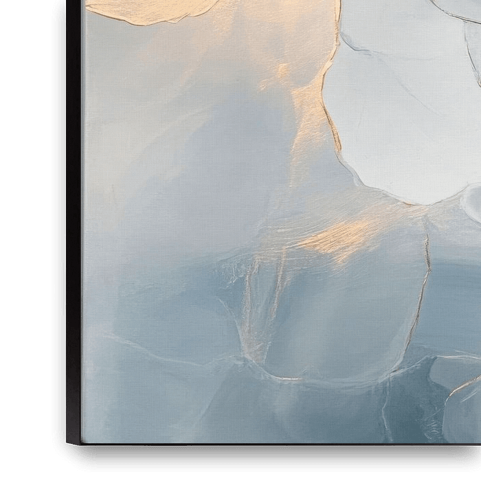 Een zacht spel van licht en schaduw ontvouwt zich in harmonieuze blauwtinten, afgewisseld met een vleugje gouden stralen. De gebogen vormen lijken te zweven in een dromerige dans, terwijl de koele tinten een rustgevende, bijna mystieke sfeer creëren. Vloeiende texturen smelten hier samen tot een uitnodigende, abstracte compositie.
