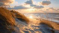 Deze afbeelding is er één uit een grotere serie. De afbeeldingen tonen een strandlandschap met duinen en wuivend gras. Het lichtspel van de zon tussen de wolken door creëert een dynamisch schaduw- en lichteffect over het zand en de zee. De golven rollen rustig het strand op, terwijl de lucht gevuld is met zachte wolken waar zonnestralen doorheen schijnen. Het tafereel straalt een gevoel van rust en natuurlijke schoonheid uit, waarbij de focus ligt op het harmonieuze samenspel van licht en schaduw in het kustlandschap.